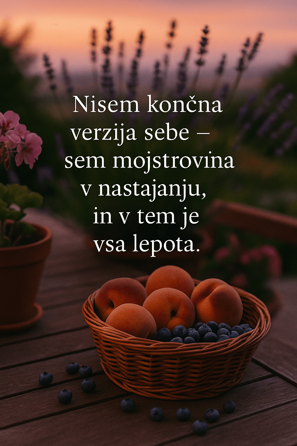 Tisti večer na terasi, obdana s sivko, breskvami in modrino borovnic, sem razumela, da vprašanje “Kdo sem zdaj?” ni cilj.