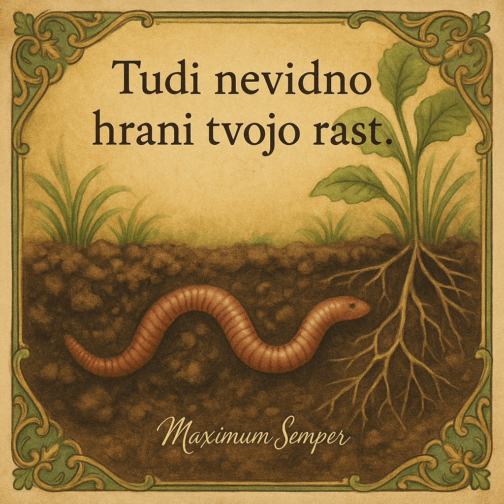 V zemlji, v kateri se je čez poletje razbohotilo na desetine različnih zelenjav in zelišč, so se premikali deževniki. Njihova tiha moč me je naučila, da ni vse, kar je pomembno, vedno tudi vidno. Včasih najdragocenejše delo opravimo prav v tišini, pod površino. “Tudi nevidno hrani rast. Ceni svoje korenine.”