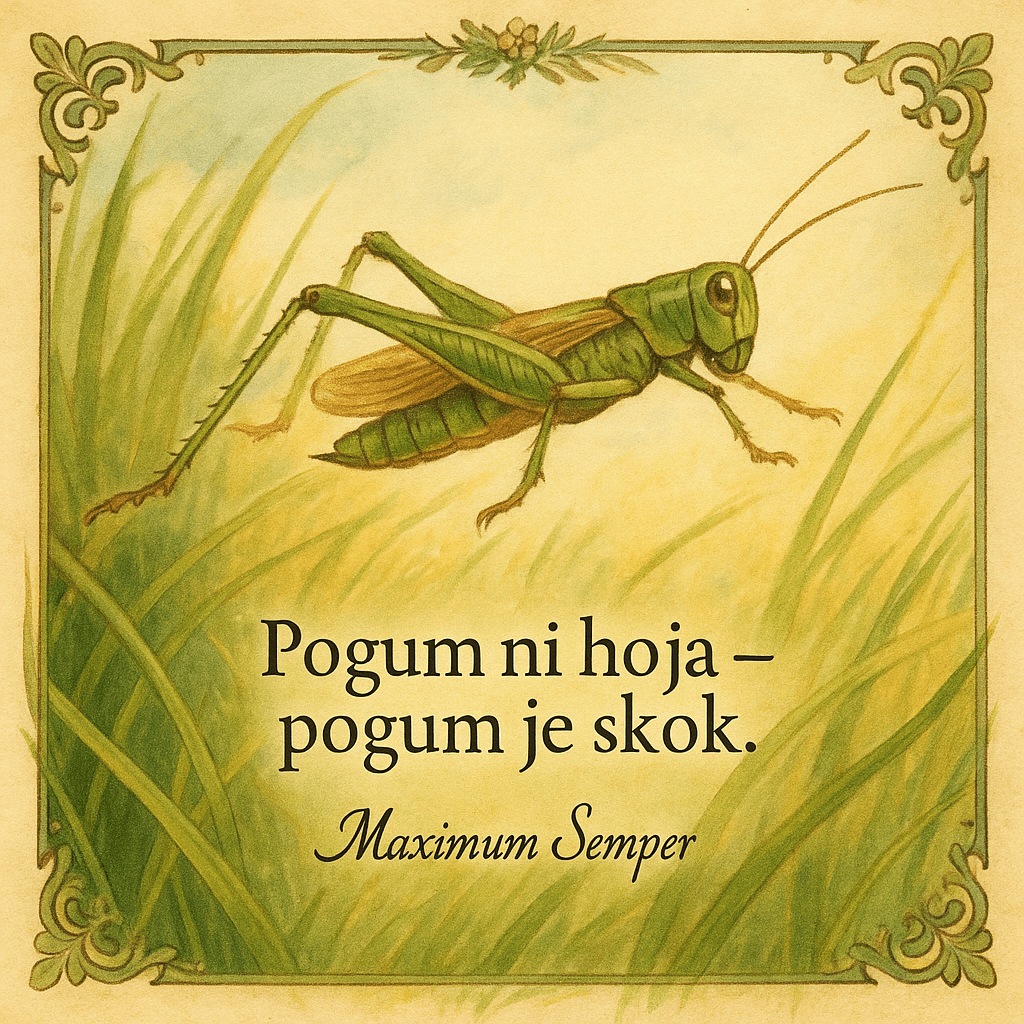 Po vrtu so, v veselje naših muc, skakale kobilice – vedno v enem samem loku, vedno naprej. Vsakič, ko so odskočile, sem začutila ritem svojega srca. Kot da bi me opominjale: življenje ne čaka, pogum se rodi v trenutku, ko stopiš naprej. Sporočilo kobilic je bilo jasno: “Čas je za pogumen skok. Pravi trenutek je zdaj.”