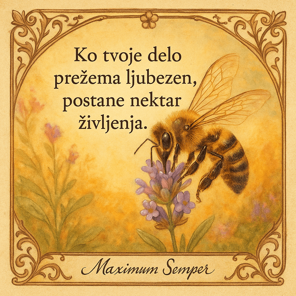 Na cvetovih sivke, ognjiča in mete so brenčale čebele. Ko sem jih opazovala, sem razumela, da je njihova moč v sodelovanju in v ritmu narave. Naučile so me, da pravo delo nikoli ni samo opravilo – je posvečeno dejanje, poslanstvo, ki rodi sladkost. Povabile so me k premisleku: “Sodeluj. Poveži se. Tvoje delo lahko postane nektar, če ga prežema ljubezen.”