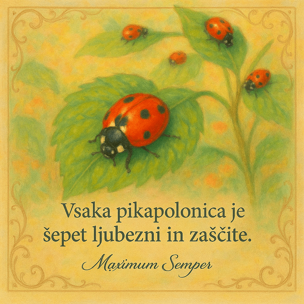 Po vrtu so poletavale pikapolonice – desetine rdečih kroglic s črnimi pikami. Zdele so se kot majhna srca, ki jih je narava poslala kot opomnik, da je okoli mene mreža nežne zaščite. Vsaka, ki je pristala na moji dlani, je bila kot droben blagoslov: “Varna si. Zaščitena si. Ljubezen je tvoj dom.”
